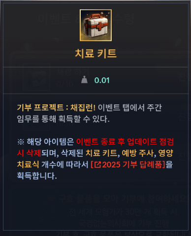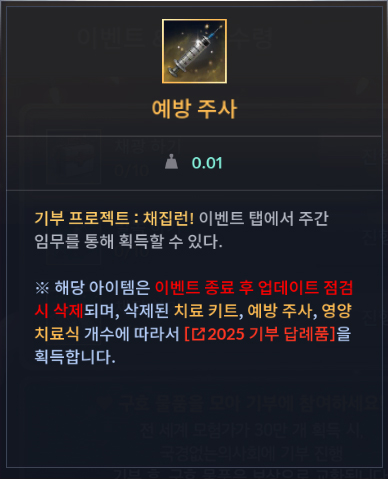 | 전 권역 '치료 키트', '예방 주사', '영양 치료식' 합계 30만개 달성 시 | 이벤트 목표 달성 시 |