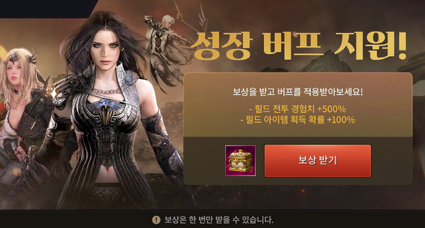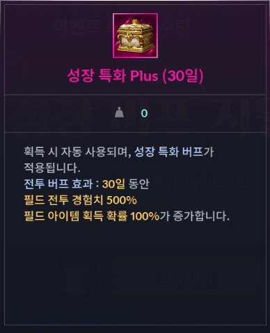 이벤트 배너를 통해 성장 특화 Plus 버프를 획득하면 30일간 전투 경험치 500% 및 아이템 획득 확률 100%의 효과가 적용됩니다.