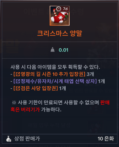 - 누적으로 달성한 매일 임무 횟수에 따라 추가 '크리스마스 양말'을 추가로 획득할 수 있습니다.