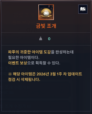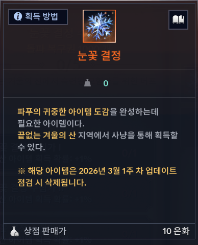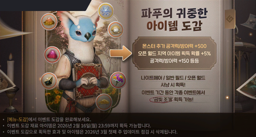 - 도감 재료 획득 기간 : 1월 6일(화) 점검 후 ~ 2월 16일(월) 23:59