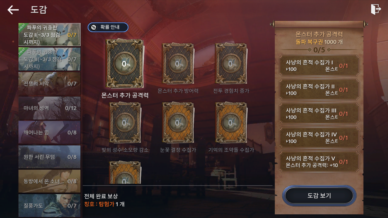 * 도감 완료 보상으로 획득할 수 있는 '탐험가' 및 '수집가'는 영구 칭호입니다.