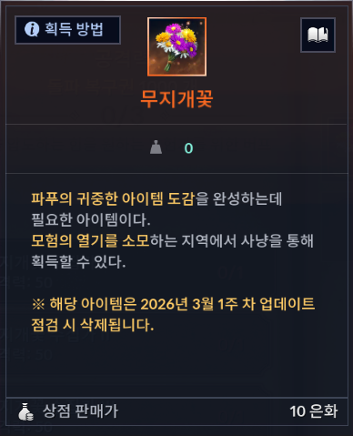 - 추가로 '모험의 열기' 소모 시, 낮은 확률로 '무지개꽃'을 획득할 수 있습니다.