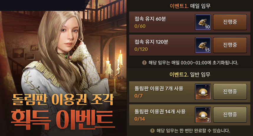 | 누적 접속 120분 | 돌림판 이용권 조각 15개 |