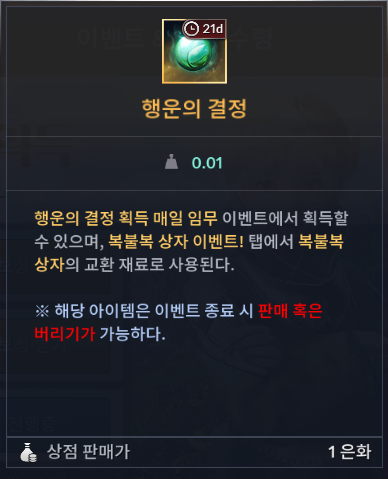 복불복 상자 이벤트!에서 활용할 수 있는 행운의 결정을 획득해 보세요.