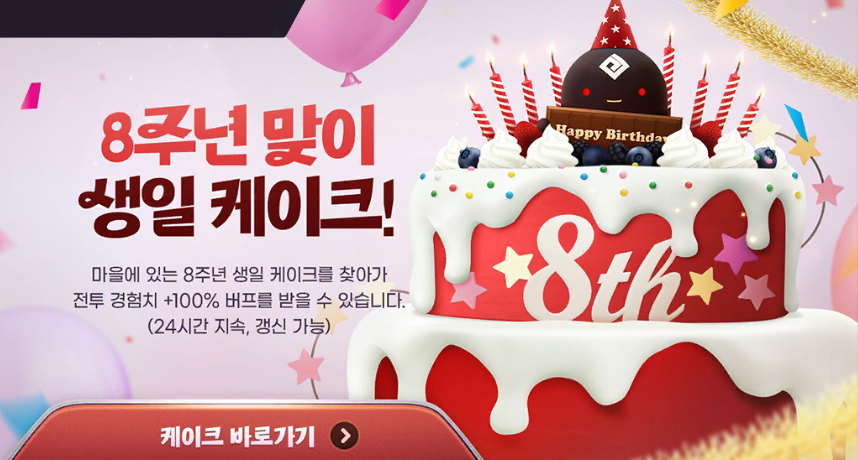 - 마을에 있는 8주년 생일 케이크를 찾아가 전투 경험치 +100% 버프를 받을 수 있습니다. (24시간 지속, 갱신 가능)