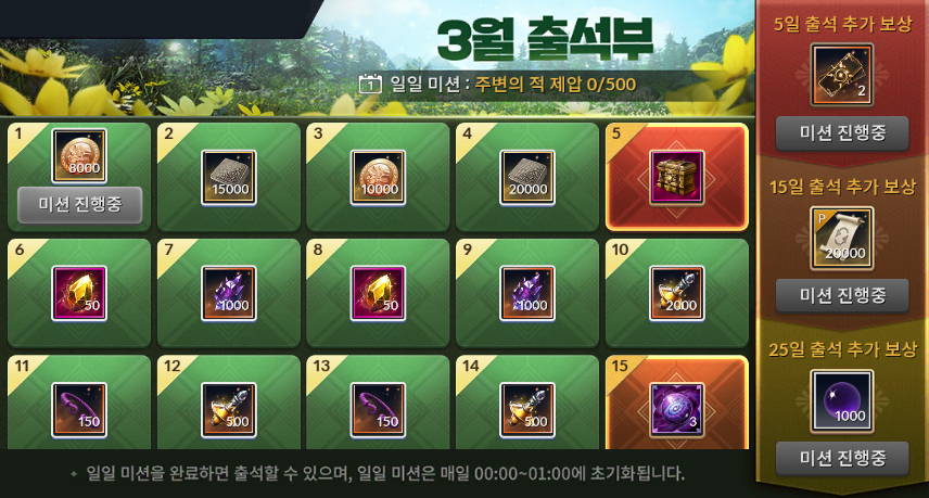 - 일일 미션을 완료하면 출석할 수 있으며, 일일 미션은 매일 00:00~01:00에 초기화됩니다.
