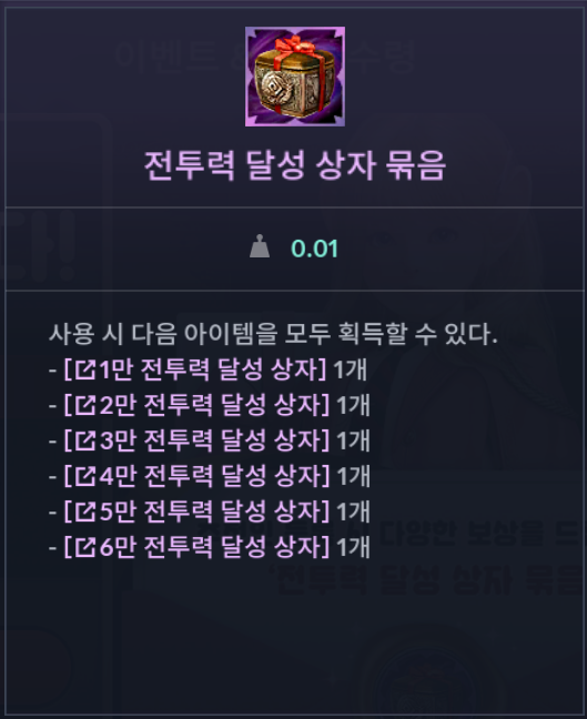 | 6만 전투력 달성 상자 (전투력 60,000 달성 시 사용 가능 / 아래 아이템 모두 획득) |