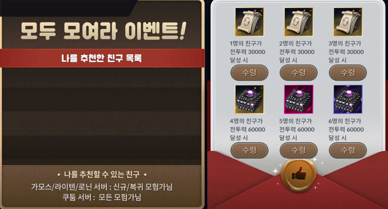 - 각 보상은 전 서버에서 한 번씩만 받을 수 있습니다.
