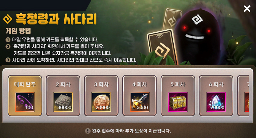 - 사다리를 오르기 위한 '흑정령 카드' 15개가 매일 우편으로 지급됩니다.