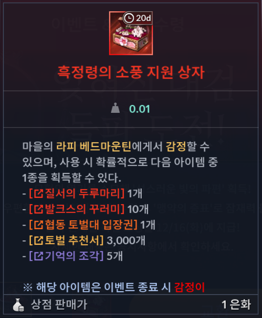 - '흑정령의 소풍 지원 상자'는 이벤트 기간 내에만 감정할 수 있습니다.
