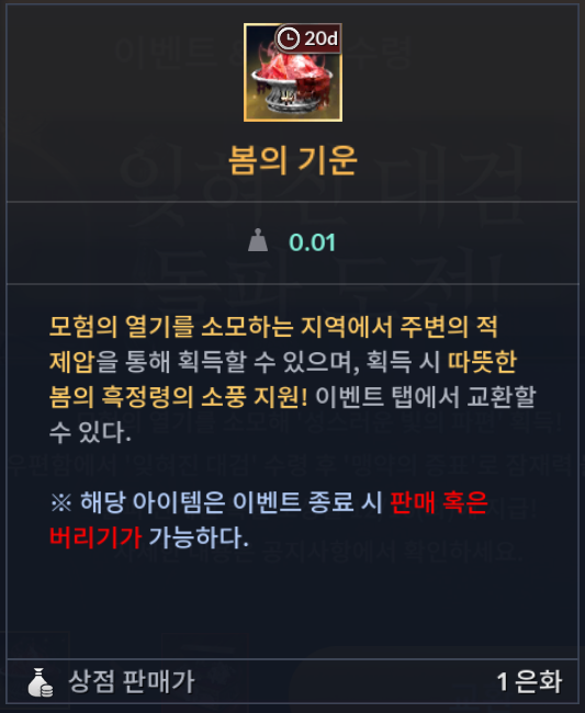 - 모험의 열기를 소모하여 '봄의 기운'을 획득할 수 있습니다.