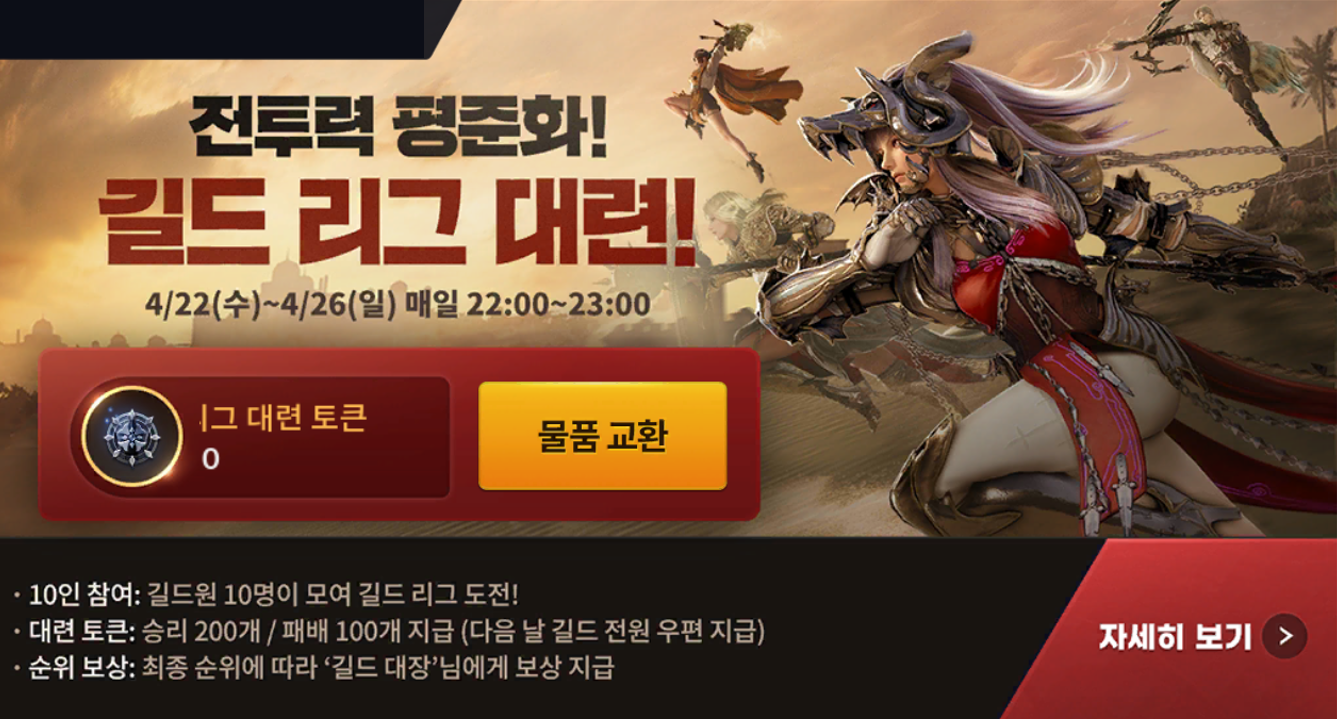 - 4월 22일(수) ~ 4월 26일(일) 매일 22:00 ~ 23:00 기간에 '전투력 평준화 버전'의 길드 리그가 진행됩니다.