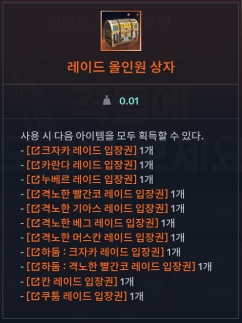 이벤트 보상으로 레이드 올인원 상자 2개를 획득할 수 있습니다.
