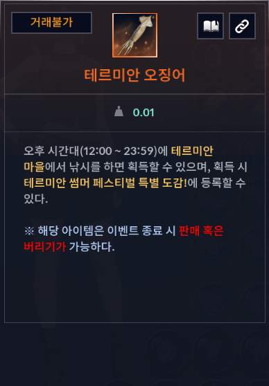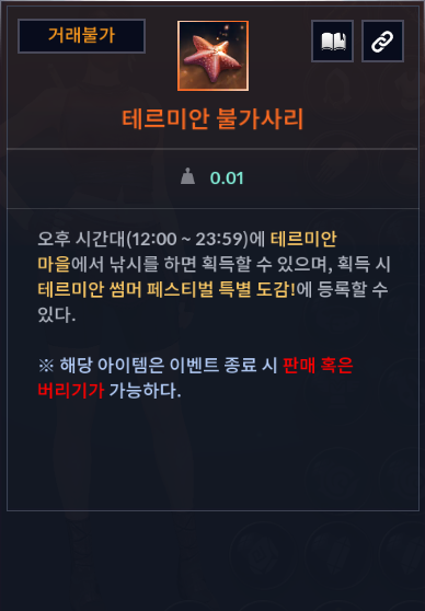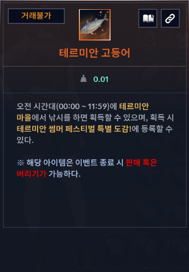 - 테르미안 물고기는 이벤트가 종료되면 20만 은화에 판매하실 수 있습니다.