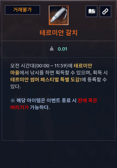 - 낚시를 통해 얻은 물고기는 [테르미안] 이벤트 도감에 등록하고 보상을 획득할 수 있습니다.