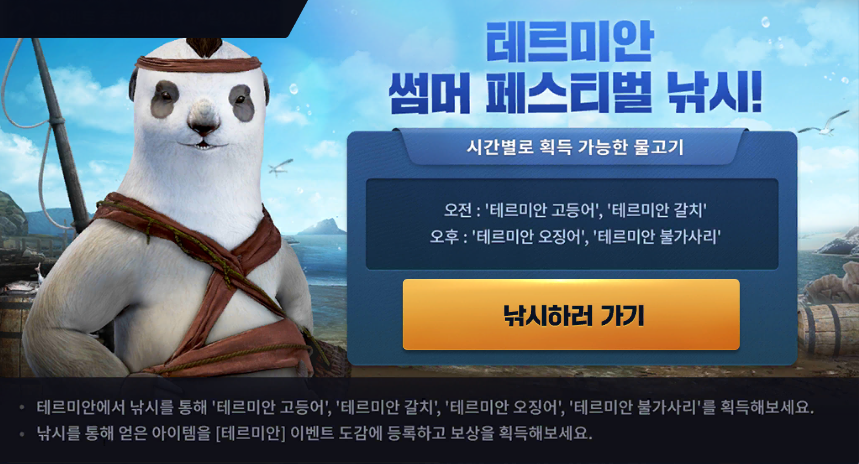 - [낚시하러 가기] 버튼을 눌러 테르미안 마을로 이동하여 이벤트 물고기를 낚시할 수 있습니다.