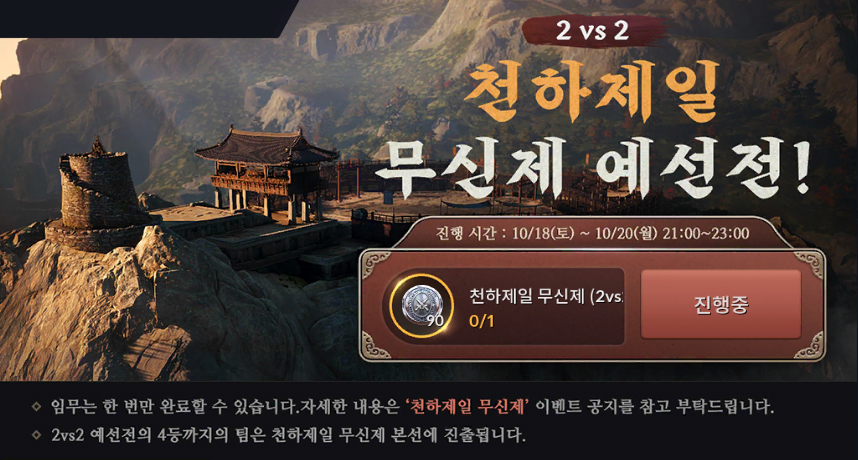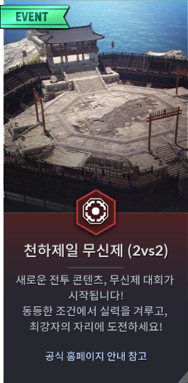 ※ 천하제일 무신제(1vs1)가 종료된 이후, 재접속하지 않으신 경우 천하제일 무신제(2vs2) 이벤트의 팀 구성 및 매칭 신청이 정상적으로 진행되지 않을 수 있습니다.