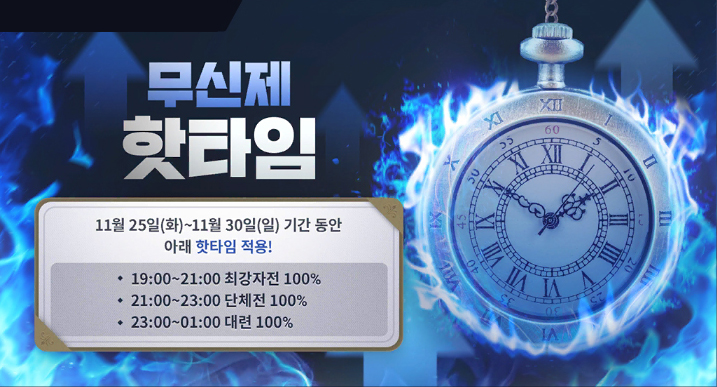 - 11월 25일(화) 업데이트 점검 후 부터 11월 30일 23:59까지 아래 시간대에 무신제 콘텐츠 핫타임이 진행됩니다.