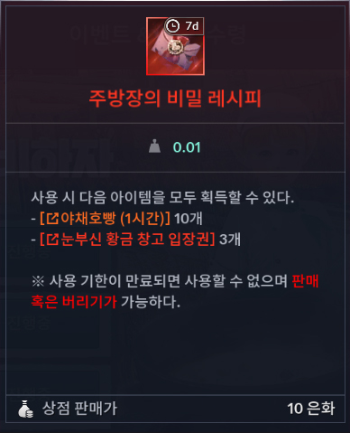 | 특수 지령 완료 1회 | 주방장의 비밀 레시피 1개 |