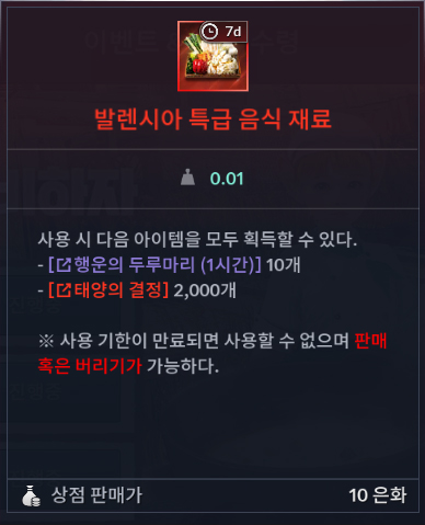| 특수 지령 완료 3회 | 발렌시아 특급 음식 재료 1개 |