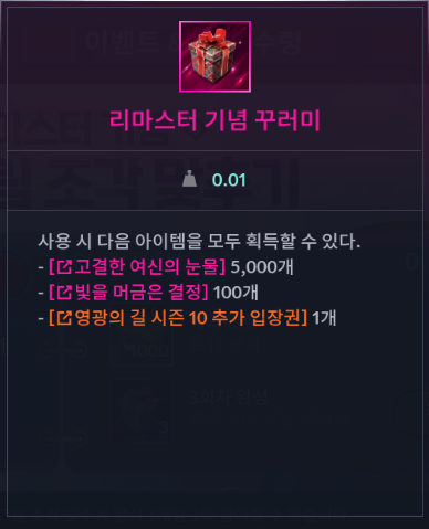 가문 당 1번 그림 조각을 3회 완성하면 '리마스터 꾸러미' 3개를 획득할 수 있습니다.