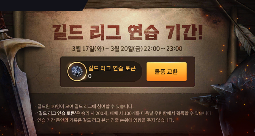 - 3월 17일(화) ~ 3월 20일(금) 기간동안 매일 22:00부터 23:00까지 길드 리그 연습이 진행됩니다.