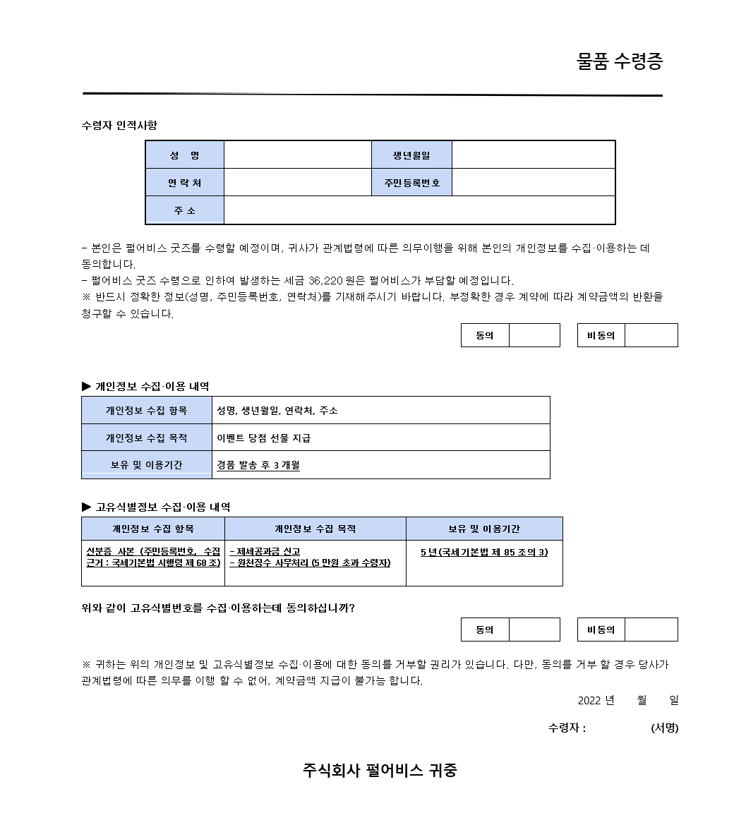 - 경품 발송을 위한 개인정보 수집/이용 동의, 경품 수령 동의, 신분증 사본이 필요합니다.