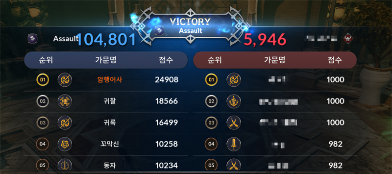 단점 : 리그를 진행하면서 여러 길드를 만나게 되는건 맞다고 보는데, 순위가 크게 차이나는 똑같은 상대를 4연속 만나는 매칭 시스템이 아쉬웠음(한두판도 아니고 4연속..손놓게 됨..)