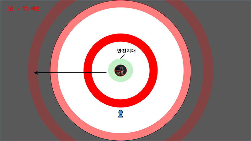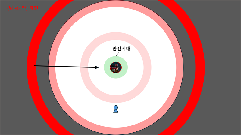- 빨간 도넛이 맵밖에서 조여오는 (밖 -> 안) 패턴 2번 이후, 보스에서 퍼져나가는 패턴(안 -> 밖)이 빠르게 등장.
