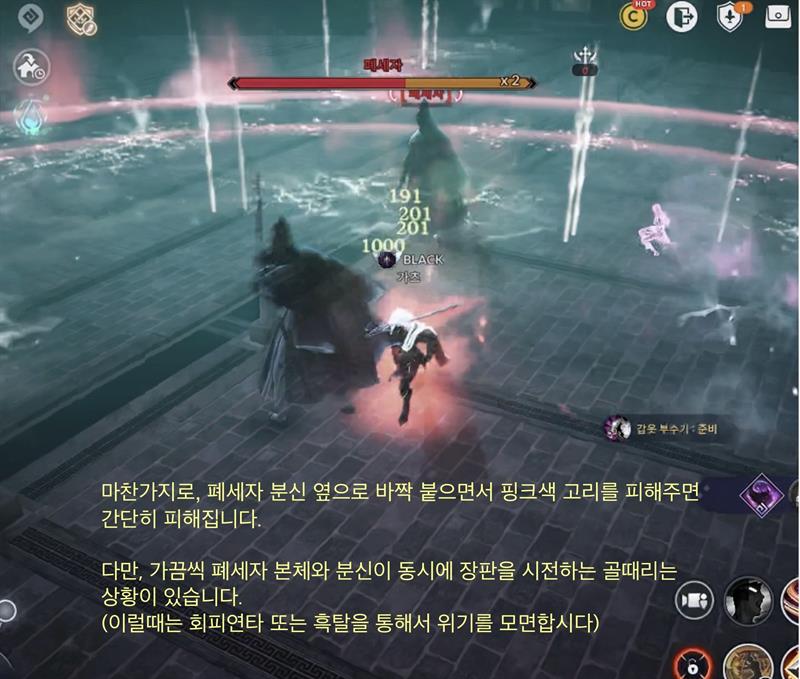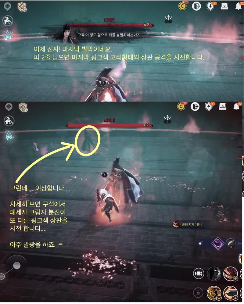 폐세자가 핑크색 장판 공격을 할때 자세~히 보면, 구석에서 폐세자의 그림자 분신이 똑같은 핑크색 장판을 시전합니다.