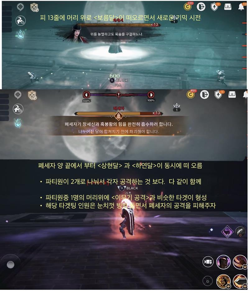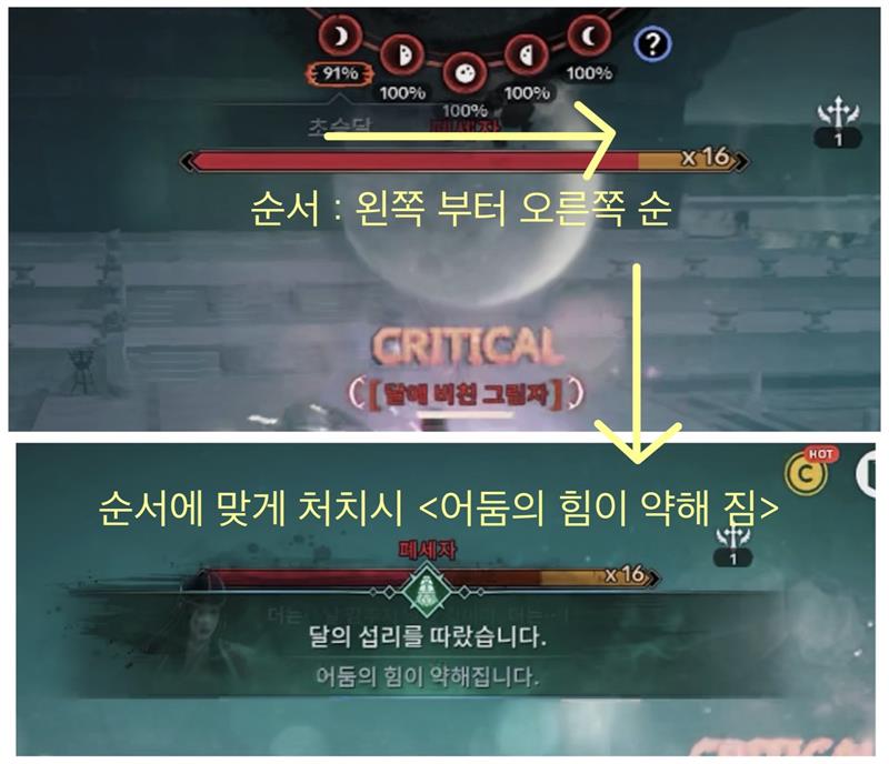 빠르게 양옆으로 2개 파티로 나눠서 상현달 / 하현달을 공략해서 처치 합시다.