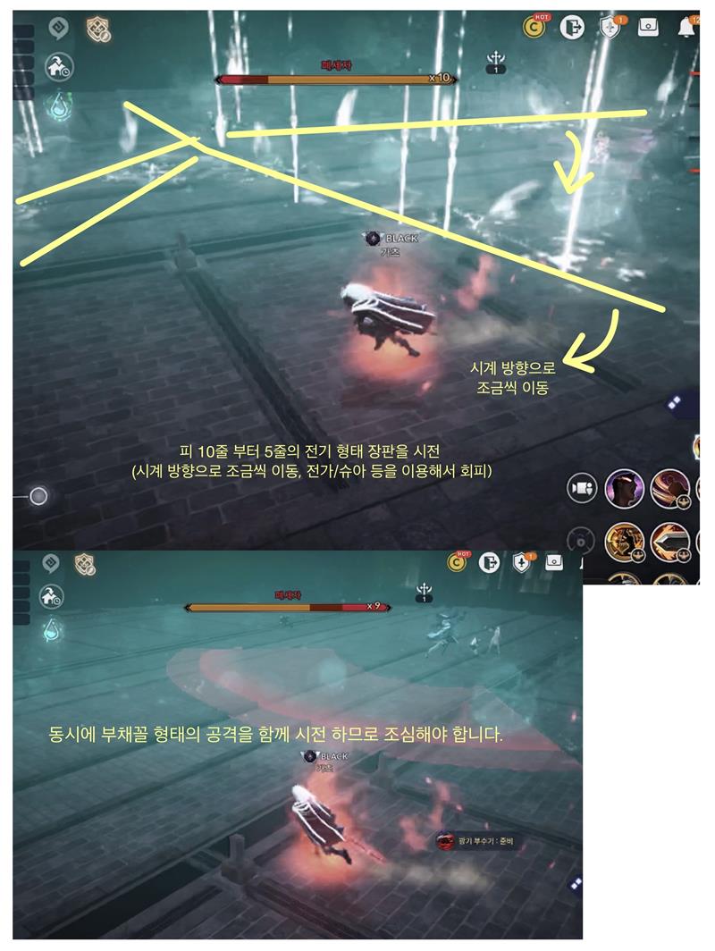 시계방향으로 조금씩 움직이면서 피하면 됩니다.  피하면서 가볍게 공격해 주면 되지만,