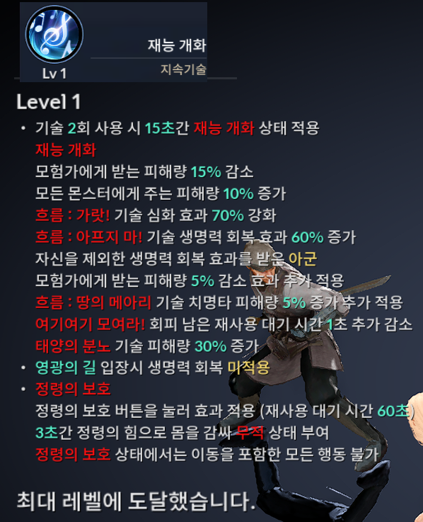자신과 아군에게 10퍼센트의 모험가피해량감소 효과와 은신해제효과, 시전시 2초간 잡기불가 효과가있습니다.