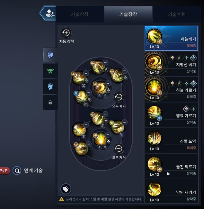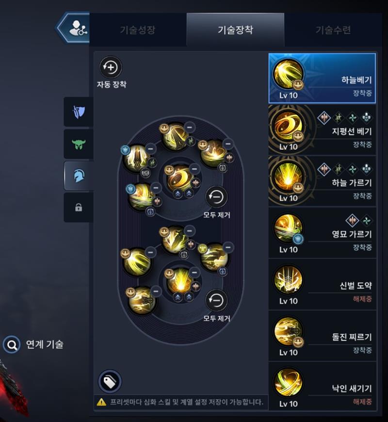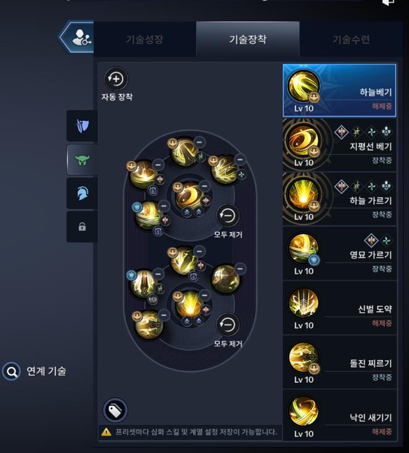 지평선베기/하늘가르기 라밤스킬을 기술피해량증가와고정피해로 설정하여 사용하고 있습니다.
