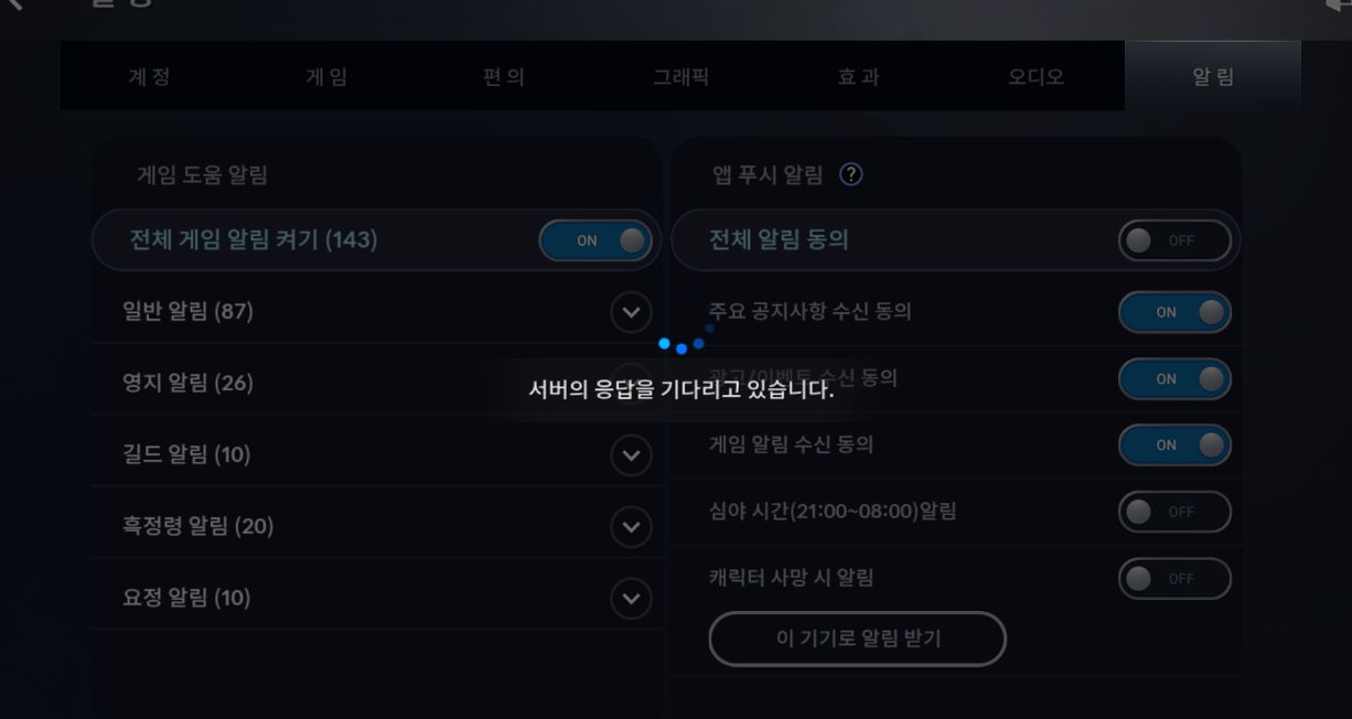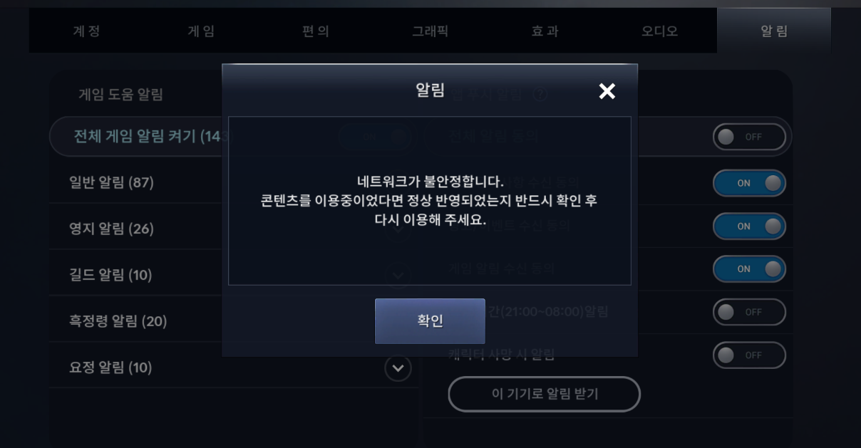 - '이 기기로 알림 받기' 터치 시, 서버 응답 및 네트워크 불안정 안내 메시지가 표시되는 현상 (2025/10/21 13:00, 내용 추가)