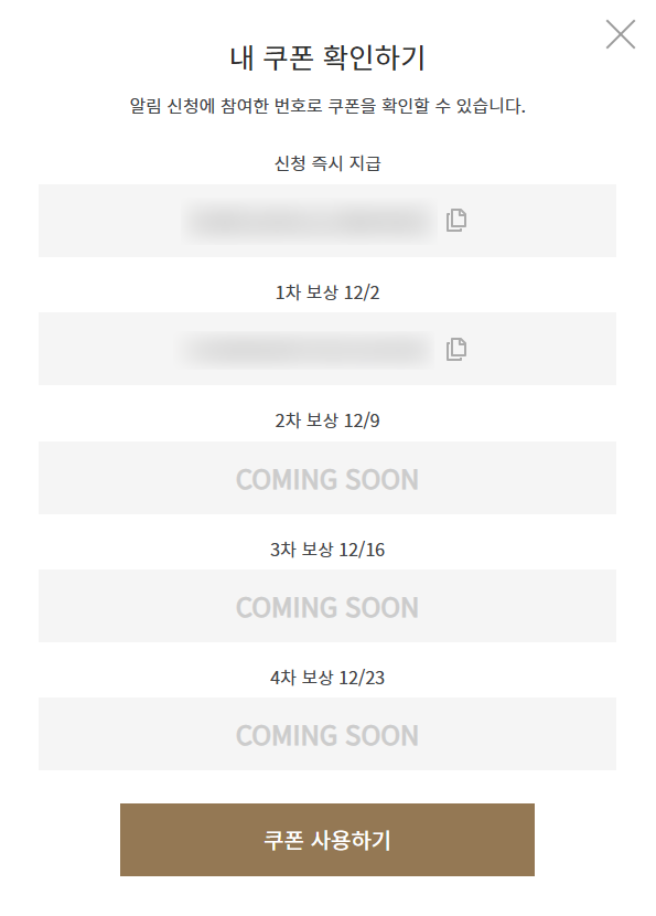 알림 신청 페이지 내 '내 쿠폰 확인하기' 버튼을 통해 직접 쿠폰 번호를 확인할 수 있습니다.