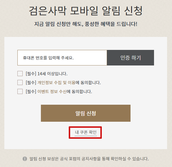 알림 신청 페이지 내 '내 쿠폰 확인하기' 버튼을 통해 직접 쿠폰 번호를 확인할 수 있습니다.
