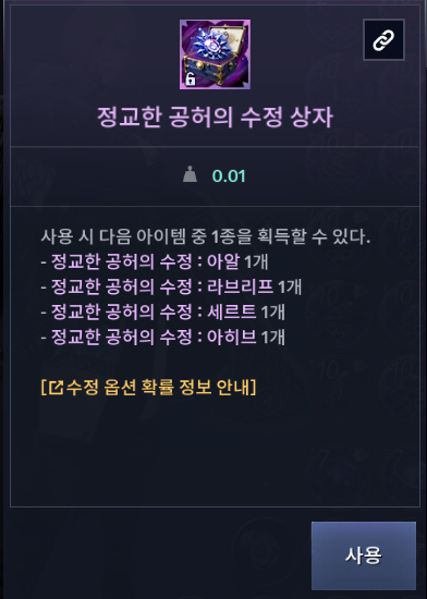 ※ 정교한 공허의 수정은 장신구에 장착할 수 있습니다. ※ 혼돈, 공허 등급의 잠재력 각성 +6 장비에 잠재력 각성을 시도하여, 100%의 확률로 성공할 수 있습니다.