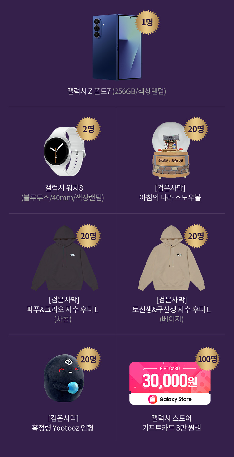 ㆍ본 이벤트 기간 동안 [검은사막 모바일 for samsung]에서 이벤트에 참여하고 누적 결제 금액 30만 원 이상인 참여자 중 추첨을 통하여 이벤트 페이지에 사전 고지된 경품(갤럭시 Z폴드7 (256GB/색상랜덤), 갤럭시 워치 8 (블루트스/40mm/색상랜덤), [검은사막] 아침의 나라 스노우볼, [검은사막] 파푸&크리오 자수 후디 L (차콜), [검은사막] 토선생&구선생 자수 후디 L (베이지), [검은사막] 흑정령 Yootooz 인형, 갤럭시 스토어 기프트카드 3만 원권)을 지급합니다. 경품은 준비된 수량 내에서 한 참여자 당 1회에 한하여 당첨될 수 있으며, 중복 당첨되지 않습니다. (동일한 연락처로 다수 응모한 참여자는 당첨 취소 및 향후 이벤트 참여 제한 등의 조치가 취해질 수 있습니다.)