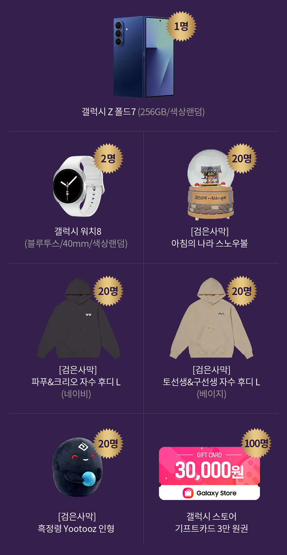 ㆍ본 이벤트 기간 동안 [검은사막 모바일 for samsung]에서 누적 결제 금액 30만 원 이상인 참여자 중 추첨을 통하여 이벤트 페이지에 사전 고지된 경품(갤럭시 Z폴드7 (256GB/색상랜덤), 갤럭시 워치 8 (블루트스/40mm/색상랜덤), [검은사막] 아침의 나라 스노우볼, [검은사막] 파푸&크리오 자수 후디 L (네이비), [검은사막] 토선생&구선생 자수 후디 L (베이지), [검은사막] 흑정령 Yootooz 인형, 갤럭시 스토어 기프트카드 3만 원권)을 지급합니다. 경품은 준비된 수량 내에서 한 참여자 당 1회에 한하여 당첨될 수 있으며, 중복 당첨되지 않습니다. (동일한 연락처로 다수 응모한 참여자는 당첨 취소 및 향후 이벤트 참여 제한 등의 조치가 취해질 수 있습니다.)