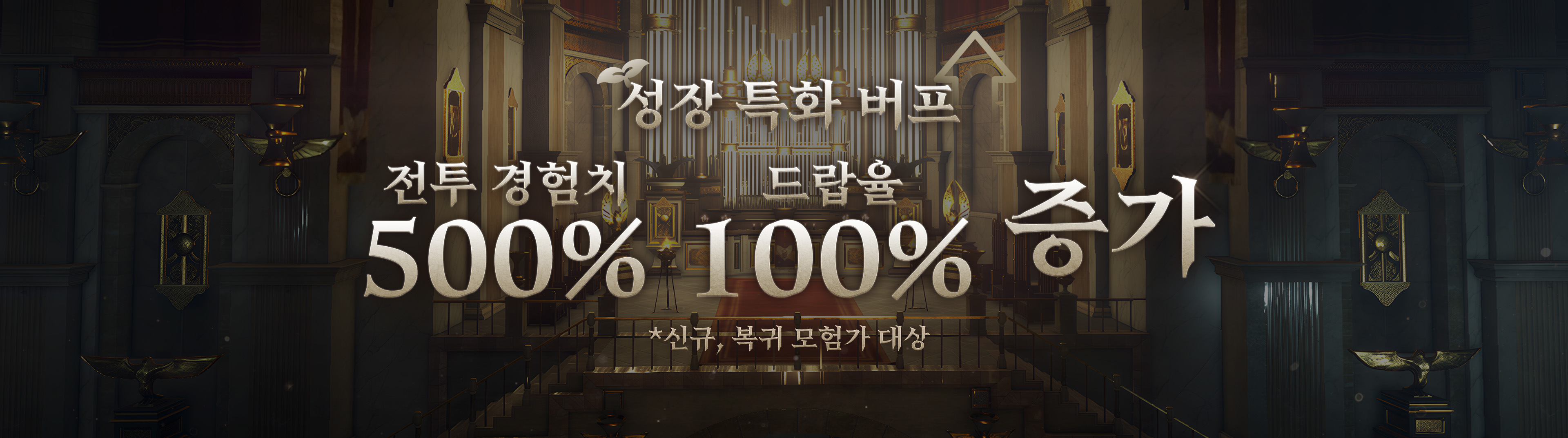신규, 복귀 모험가님은 한달 내내 모든 사냥터와 흑정령 모드에서도 전투 경험치 500%와 드랍율 100% 증가 효과를 받으실 수 있습니다.