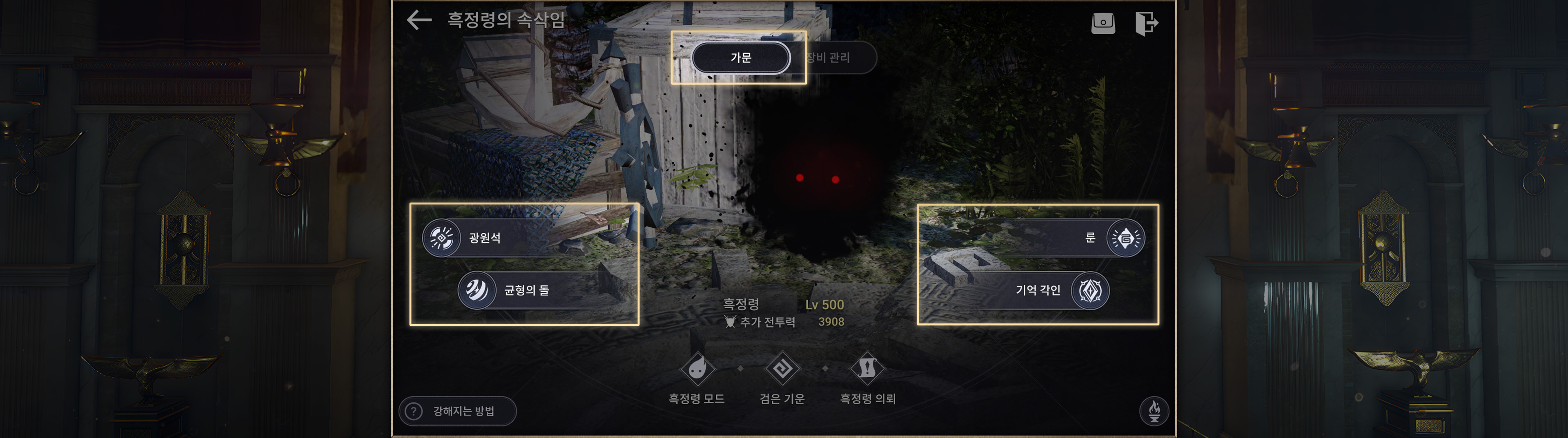 ・가문 전체에 적용되는 광원석, 균형의 돌, 룬 등을 관리할 수 있습니다.