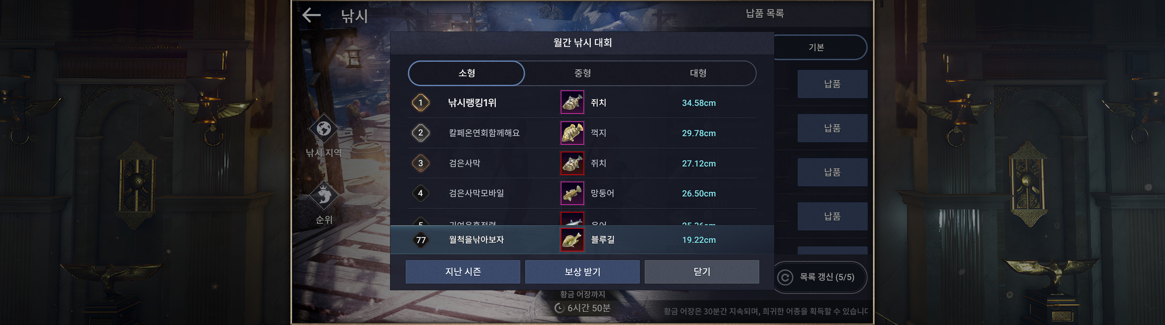 ・상위 등급의 물고기를 낚으면 랭킹에 등재되고 낚시 랭킹에서 물고기의 크기도 확인할 수 있습니다.