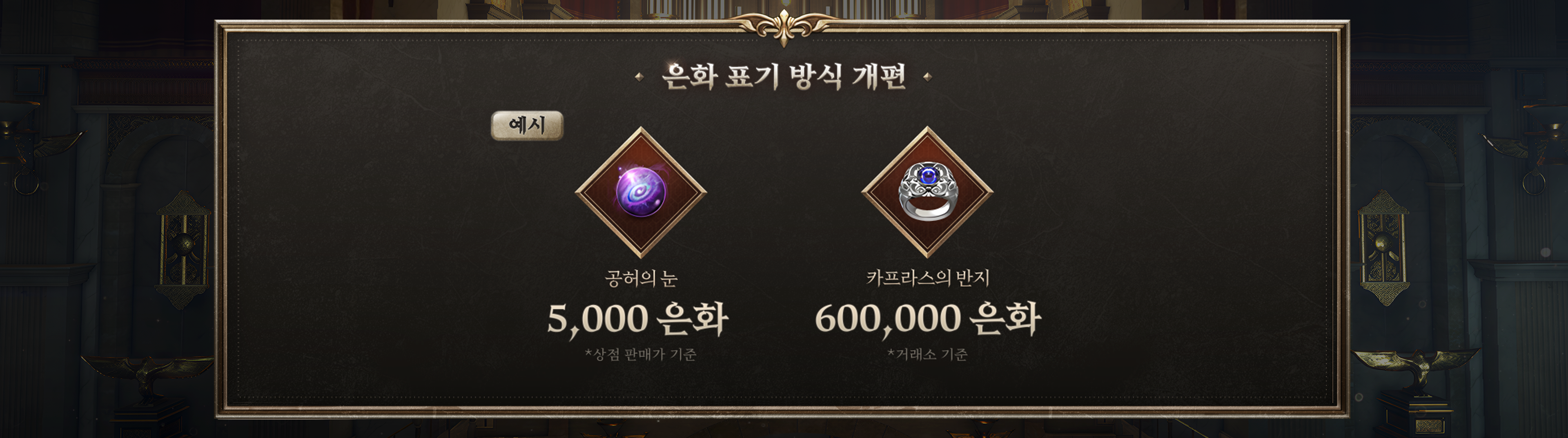 ※ 가격이 10,000 은화 미만인 아이템은 개편 이전에 모두 현재의 상점 판매가로 계산하여 소급 적용해드릴 예정이며 해당 아이템을 더 이상 상점에 판매하지 못하도록 조정할 예정입니다. (보유하고 계신 아이템은 사라지지 않고 그대로 유지됩니다.)