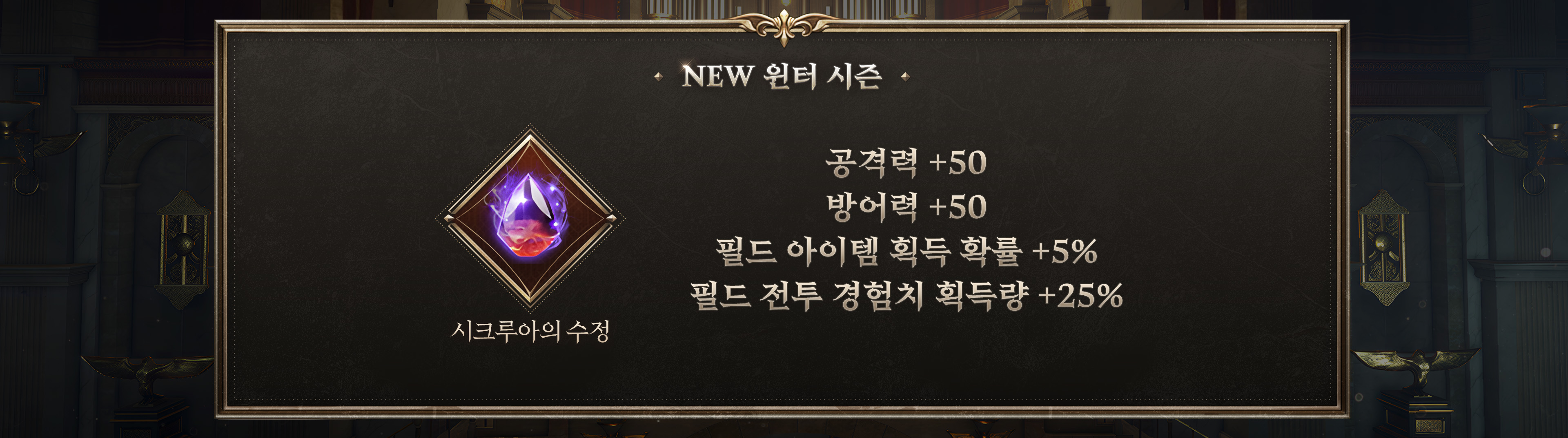 ・시크루아의 수정이 공격력 +50, 방어력+50을 보유한 신화 등급으로 초기화 됩니다.