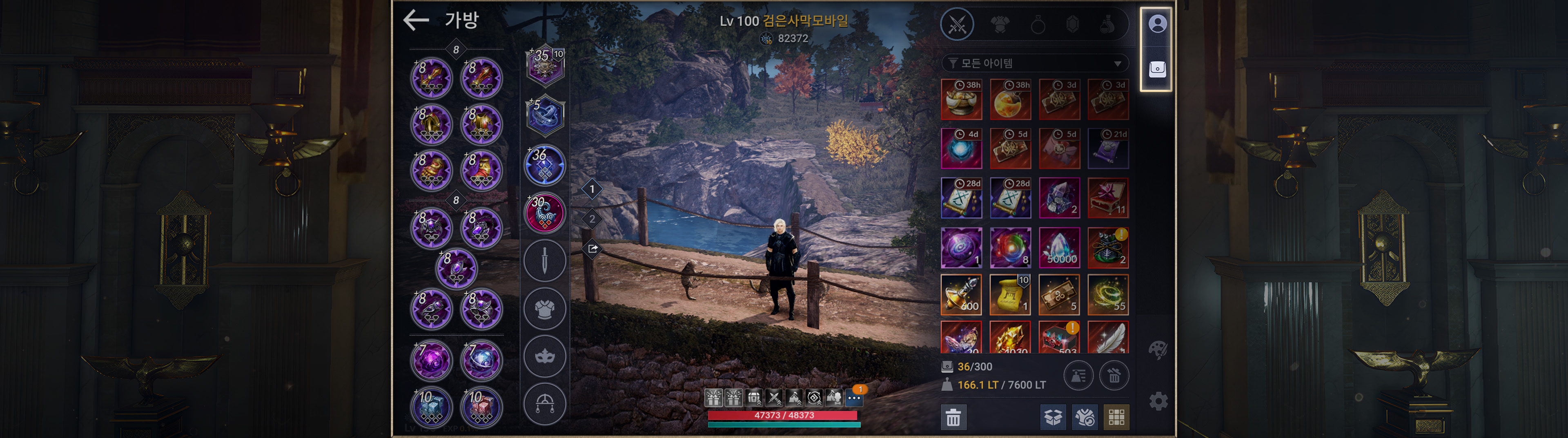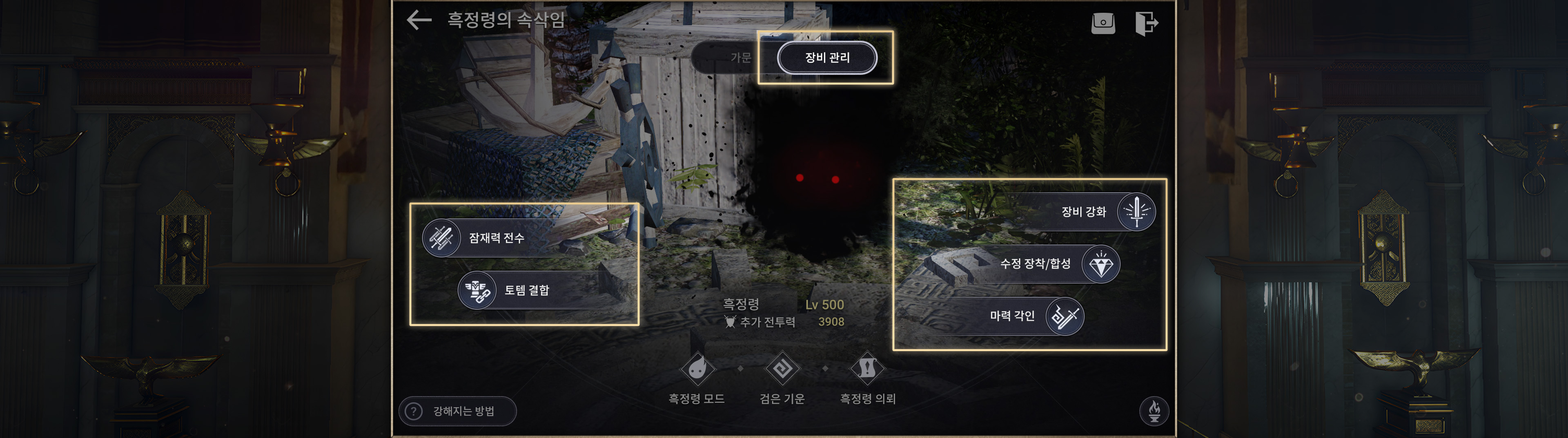 ・마력각인, 수정 장착 등 캐릭터에 적용되는 장비류를 관리할 수 있습니다.