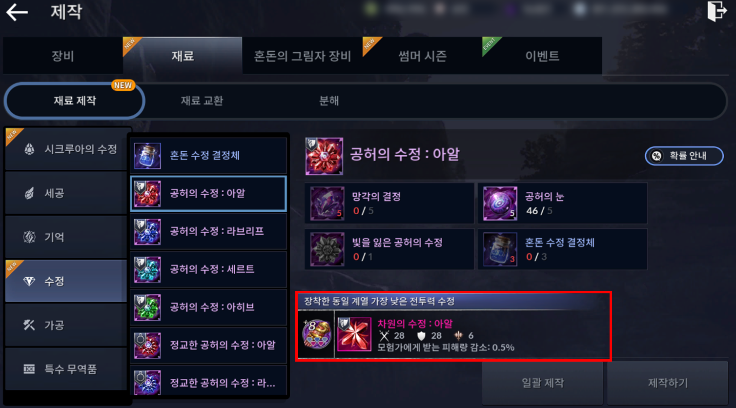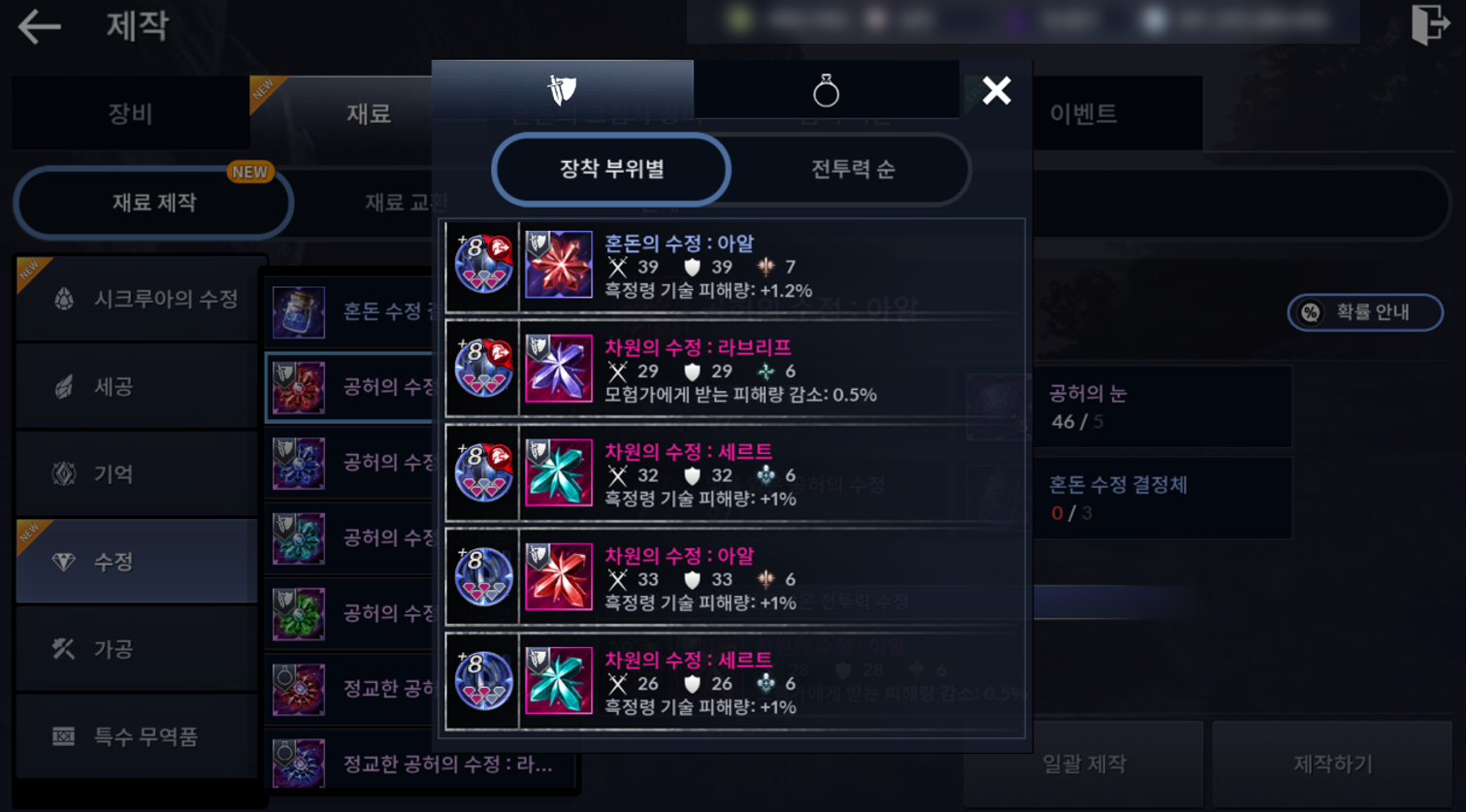 - [제작] - [수정]에서 각 계열의 수정 선택 시, '현재 장착 중인 동일 계열의 수정 중 가장 전투력이 낮은 수정' 정보를 확인할 수 있는 UI가 추가됩니다.
