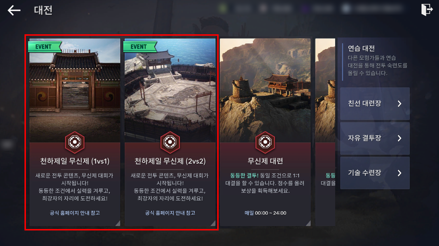 - [메뉴] - [대전]을 통해 천하제일 무신제 예선전에 참여할 수 있습니다.