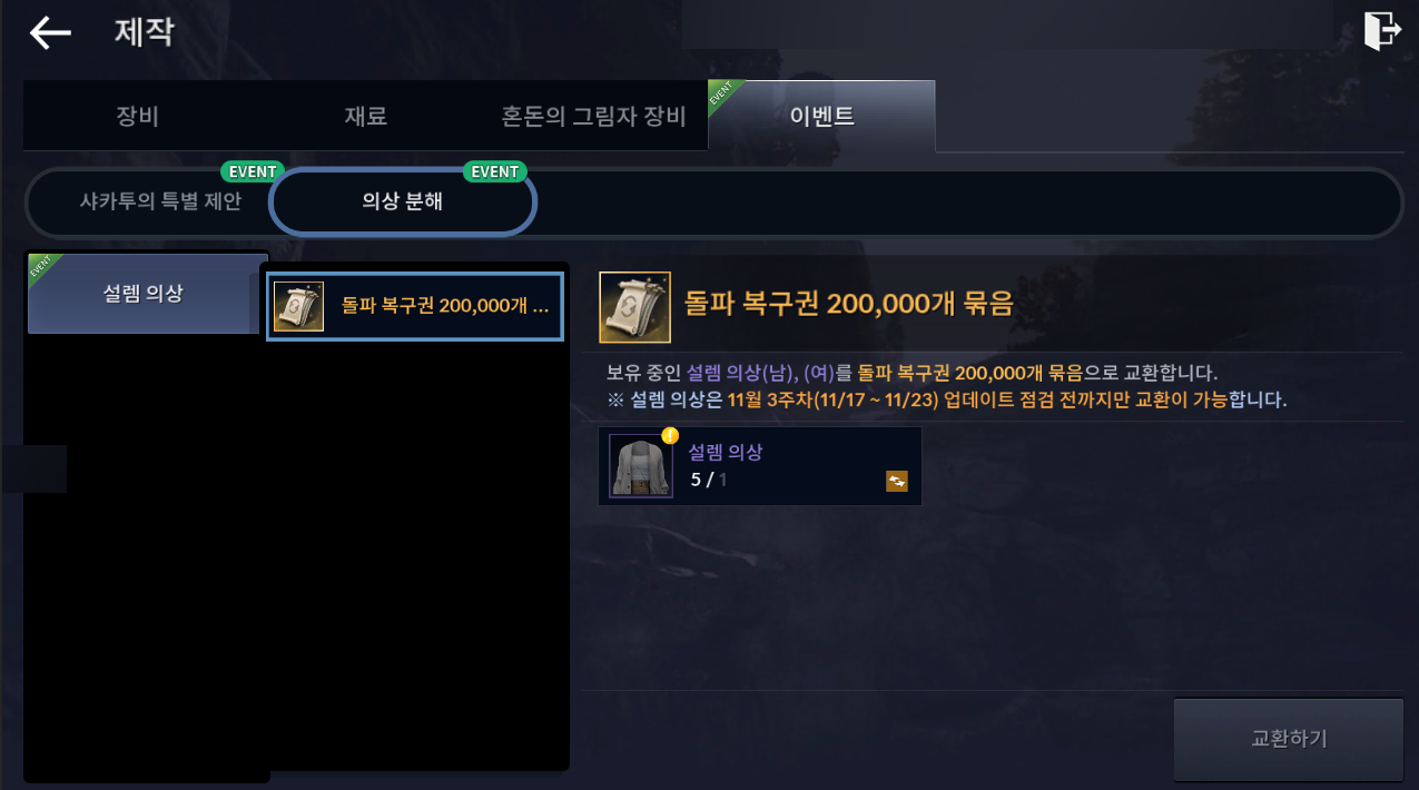 ㆍ [메뉴] - [제작] - [이벤트] - [의상 분해]를 통해 설렘 의상 1개를 돌파 복구권 200,000개 묶음으로 교환할 수 있습니다.
