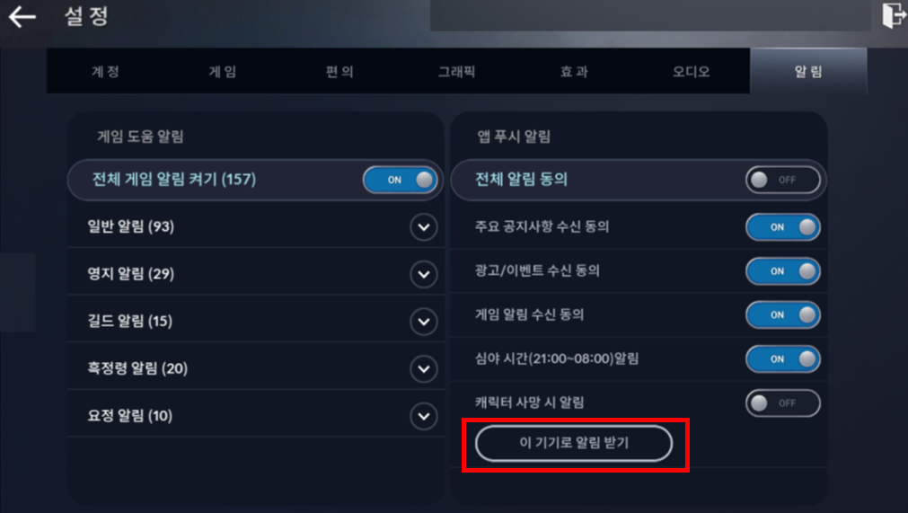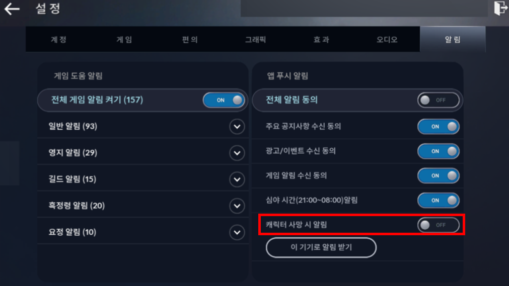 ㆍ[메뉴] - [설정] - [알림] - [앱 푸시 알림]의 ‘캐릭터 사망 시 알림’을 통해 해당 기능을 켜고 끌 수 있습니다.